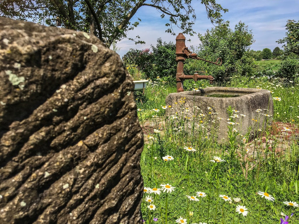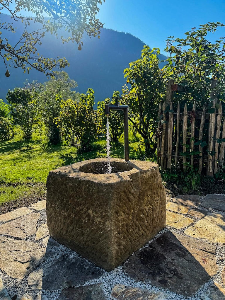 Ob alter Natursteinbrunnen, Sandstein-Säule oder antiker Bodenbelag – historische Materialien schaffen eine Verbindung zwischen Vergangenheit und Moderne.