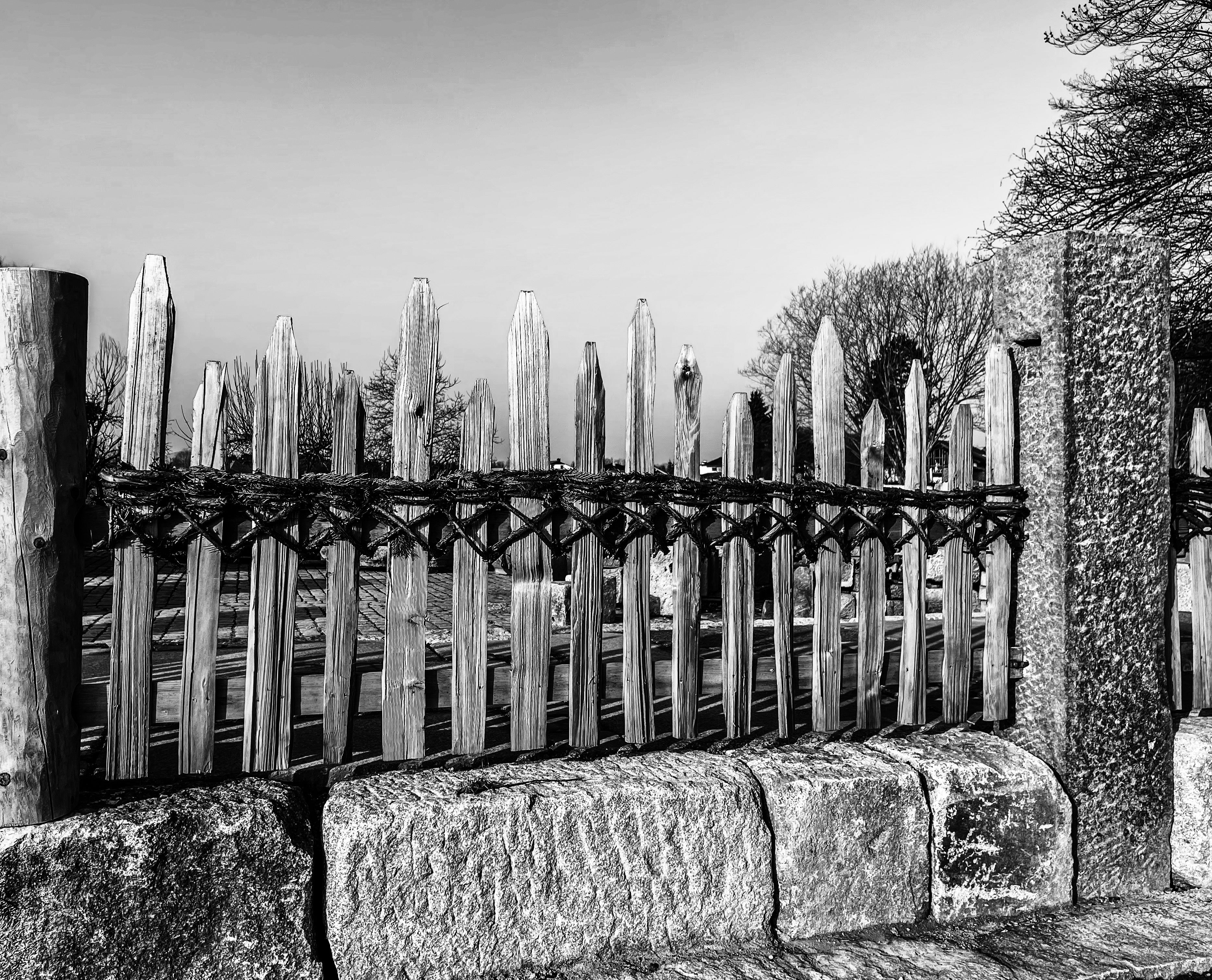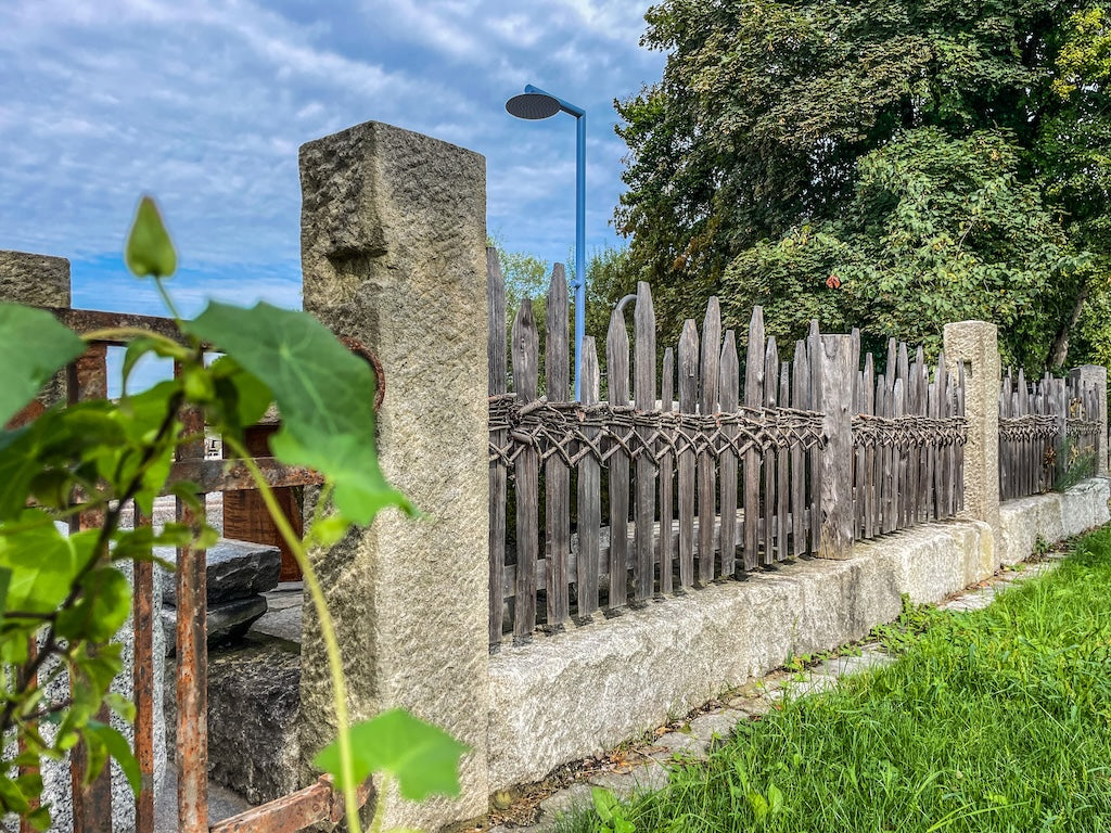 Die Kombination aus Stein und Holz ist wunderschön. Der geflochtene Lärchenspeltenzaun passt perfekt zu den alten Granit Steinpfosten.
