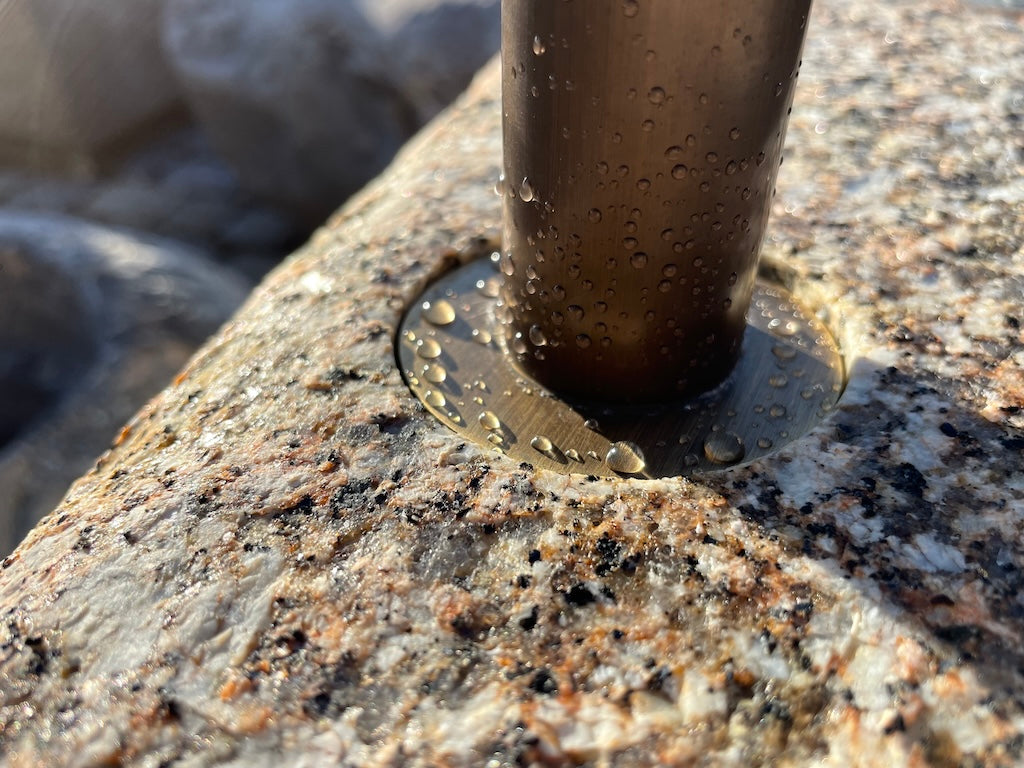 Beispiel für die freie Montage eines Messing-Wassereinlaufs hinter einem Granitbrunnen. Der Einlauf ist freistehend und erfordert spezielles Befestigungszubehör für eine stabile Installation.